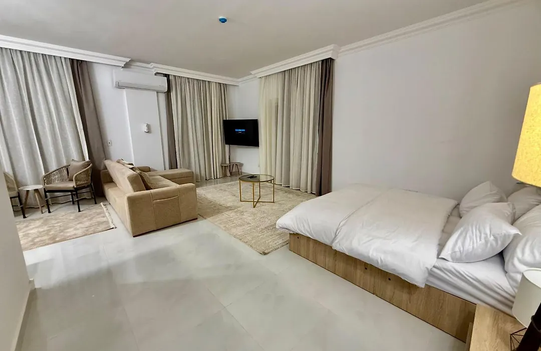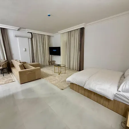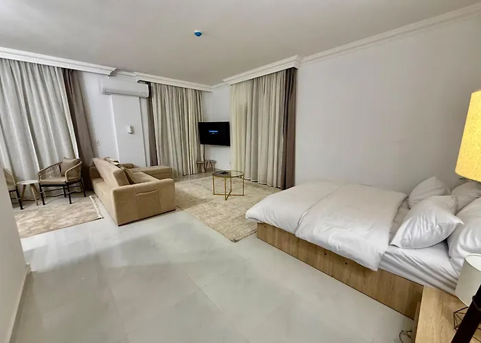 The 3-star Hottely Suites - New Cairo hotel is nestled 4.8 km from Galaxy Mall, offering 7 rooms and featuring a hot tub and a shared lounge.